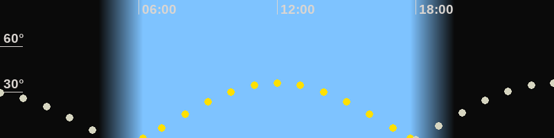 | Höchster Sonnenstand (Kulmination) | 11:59 Uhr (h = 36°) |