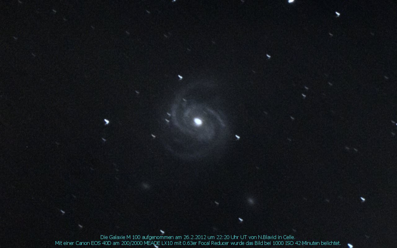 M 100 ist eine Spiralgalaxie im Virgo Galaxiehaufen. Sie ist vom Typ SABbc. Entdeckt wurde sie am 15. März 1781 von Pierre Méchain.