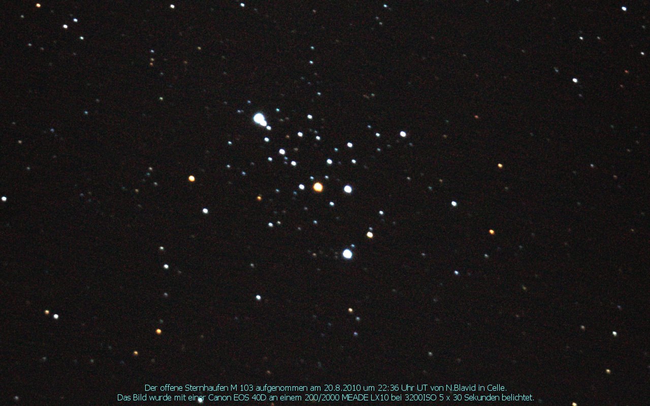 M 103 ist ein offener Sternhaufen mit ca. 172 Sternen. Er ist vom Typ III 2 p, sein Alter wird auf 9 Millionen Jahre geschätzt. Entdeckt wurde er 1781 von Pierre Méchain. Der vermeintlich zum Sternhaufen gehörende sehr helle Stern (7,3 mag) ist ein Vordergrundstern.