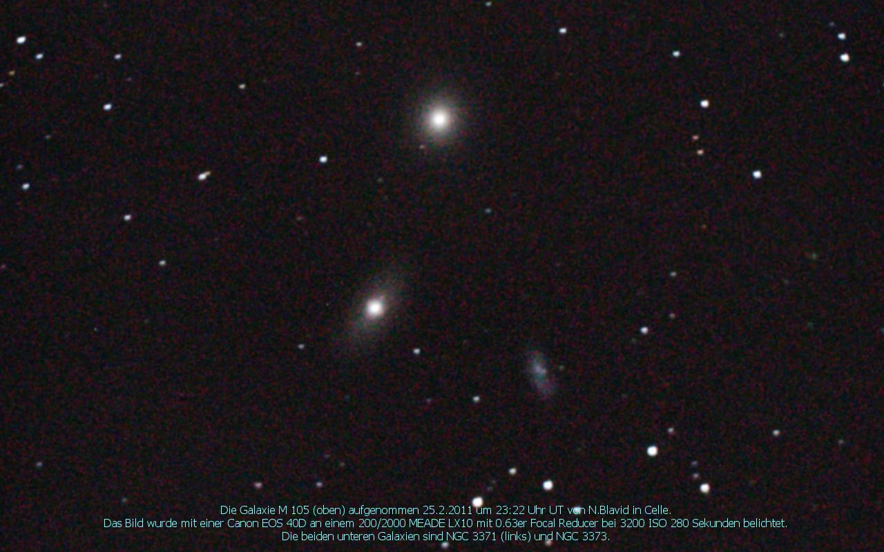 M 105 ist eine elliptische Galaxie in der M96-Gruppe. Sie ist vom Typ E1. Entdeckt wurde sie am 24. März 1781 von Pierre Méchain.