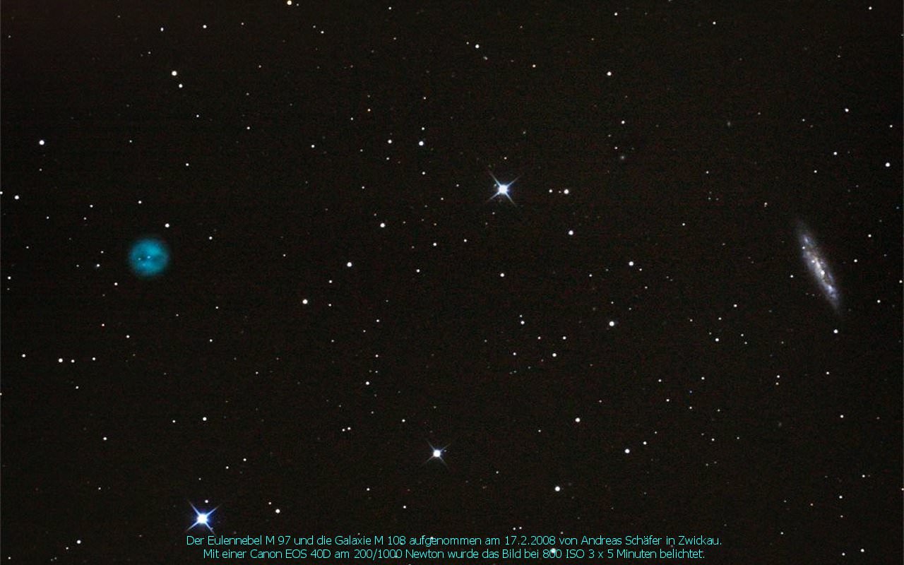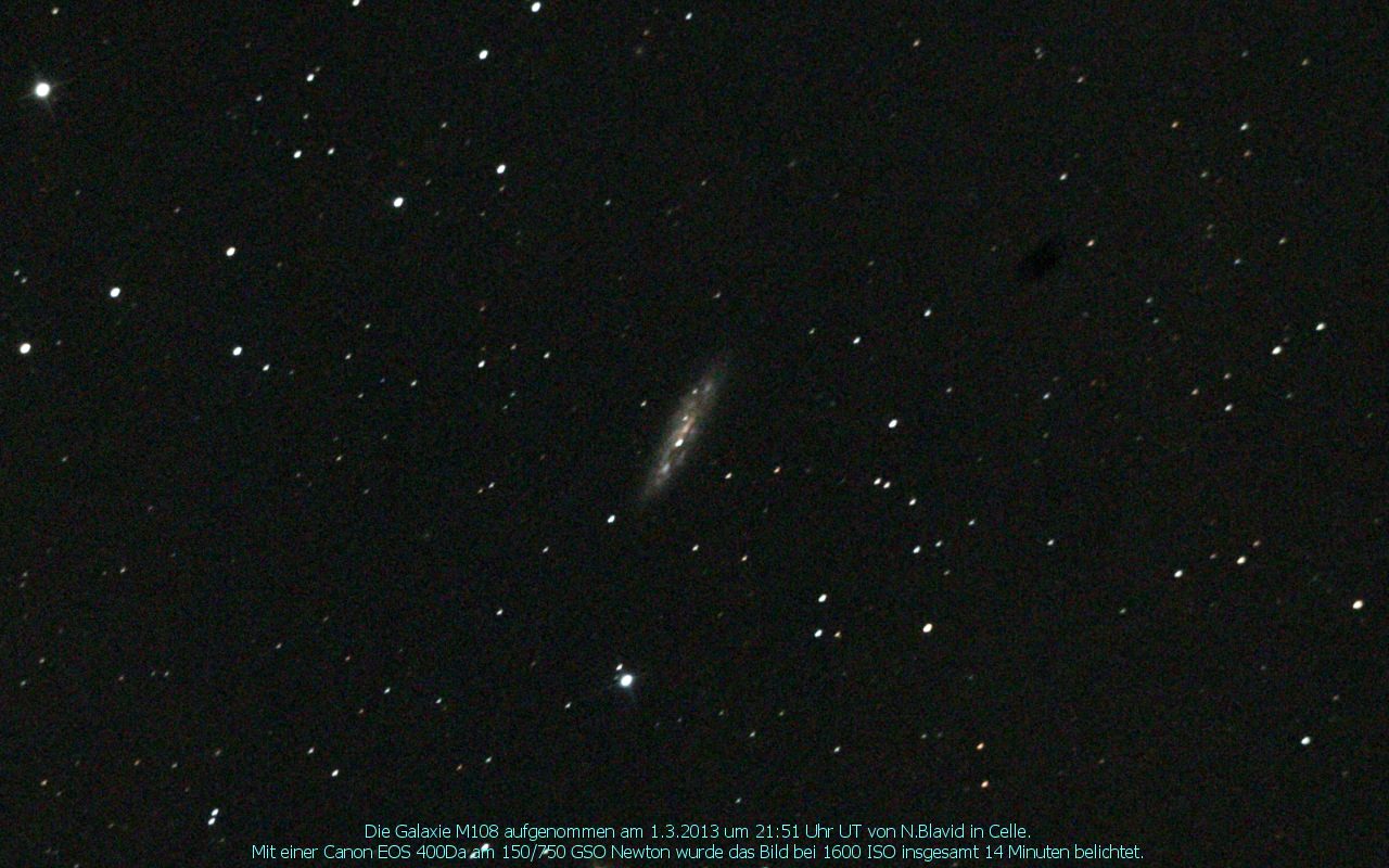 M 108 ist eine Balkenspiralgalaxie vom Typ SBcd. Entdeckt wurde sie am 16. Februar 1781 von Pierre Méchain.