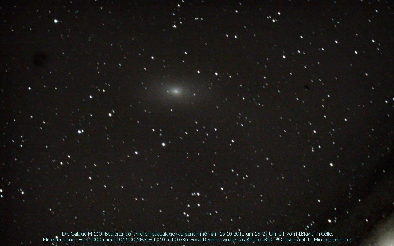 M 110 ist als elliptische Begleitgalaxie der Andromeda ebenfalls ein Mitglied der lokalen Gruppe. Sie ist vom Typ E5. Entdeckt wurde sie am 10. Oktober 1773 von Charles Messier und unabhängig davon am 27. August 1783 von Caroline Herschel.