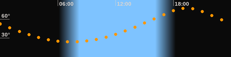 | Höchster Stand (Kulmination) | 19:23 Uhr (h = 77,4°) |