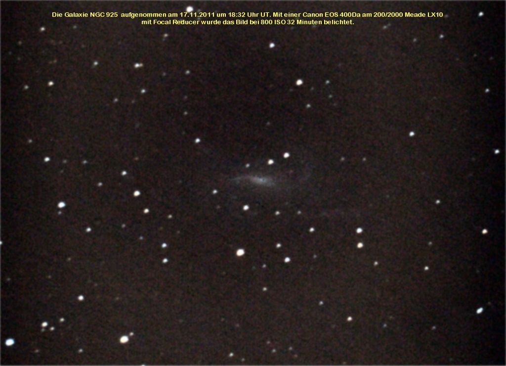 Daten und Fakten: NGC925 (UGC 1913, PGC 9332) Rektaszension 02h 27m 17s Deklination 33° 34' 4'' Helligkeit 9,9 mag (14,2 mag/arcmin^2) Scheinbare Ausdehnung 11,2' x 6,3' Entfernung ca. 28,1 Mio ly Ausdehnung ca. ?? ly Sichtbarkeit in Zwickau heute, 05.12.2025 Aufgang 11:54 Uhr im Nordosten (αAz = 27,7°) Höchster Stand (Kulmination) 21:37 Uhr (h = 72,8°) Untergang 07:24 Uhr im Nordwesten (αAz = 332,3°) Standort: Zwickau, Algorithmen siehe Credits