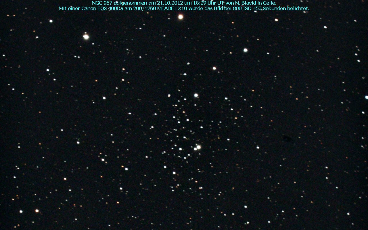 NGC 957 ist ein offener Sternhaufen vom Typ III 2 p. Entdeckt wurde das Objekt am 9.Dezember 1831 von John Herschel.