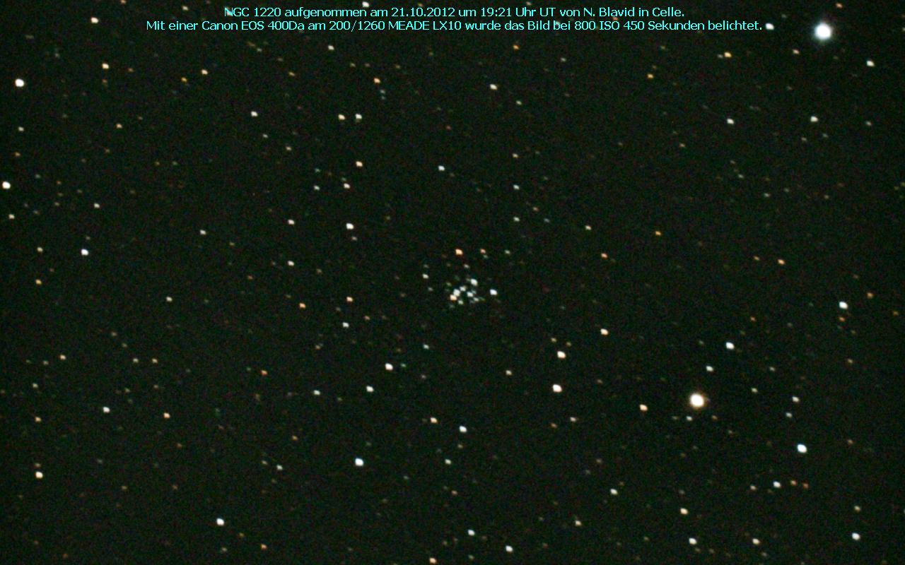NGC 1220 ist ein offener Sternhaufen vom Typ II 2 p. Entdeckt wurde das Objekt am 28. November 1831 von John Herschel.
