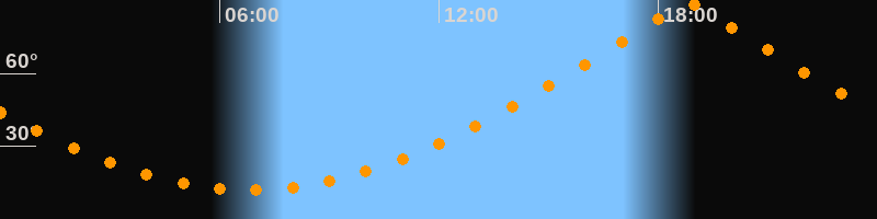 | Höchster Stand (Kulmination) | 18:49 Uhr (h = 89,3°) |