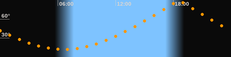 | Höchster Stand (Kulmination) | 18:34 Uhr (h = 89,3°) |