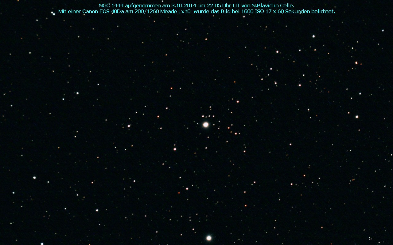 NGC 1444 ist ein offener Sternhaufen vom Typ IV 1 p. Entdeckt wurde das Objekt am 18. Dezember 1788 von Friedrich Wilhelm Herschel.