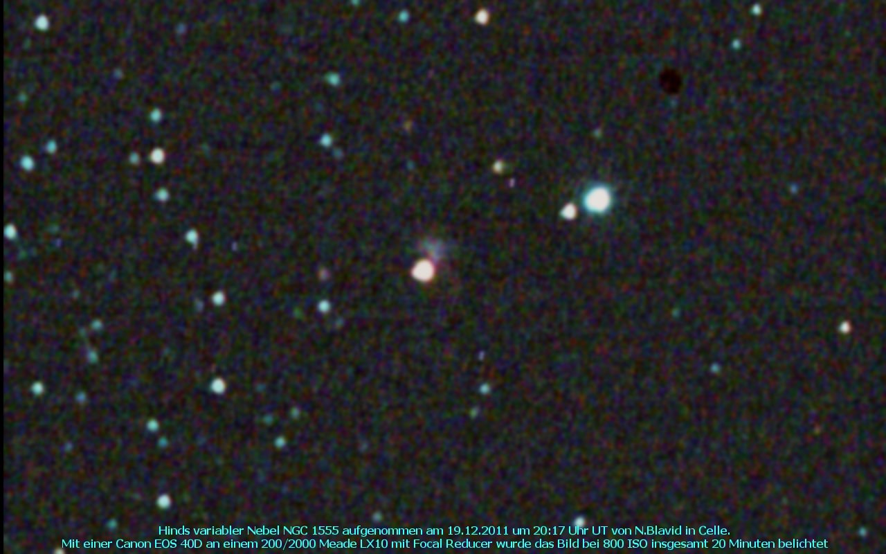 NGC 1555 ist ein Reflexionsnebel, der durch den veränderlichen Stern T Tauri beleuchtet wird, und demzufolge auch Helligkeitsschwankungen zeigt. Entdeckt wurde der Nebel am 11.Oktober 1852 von John Russell Hind.
