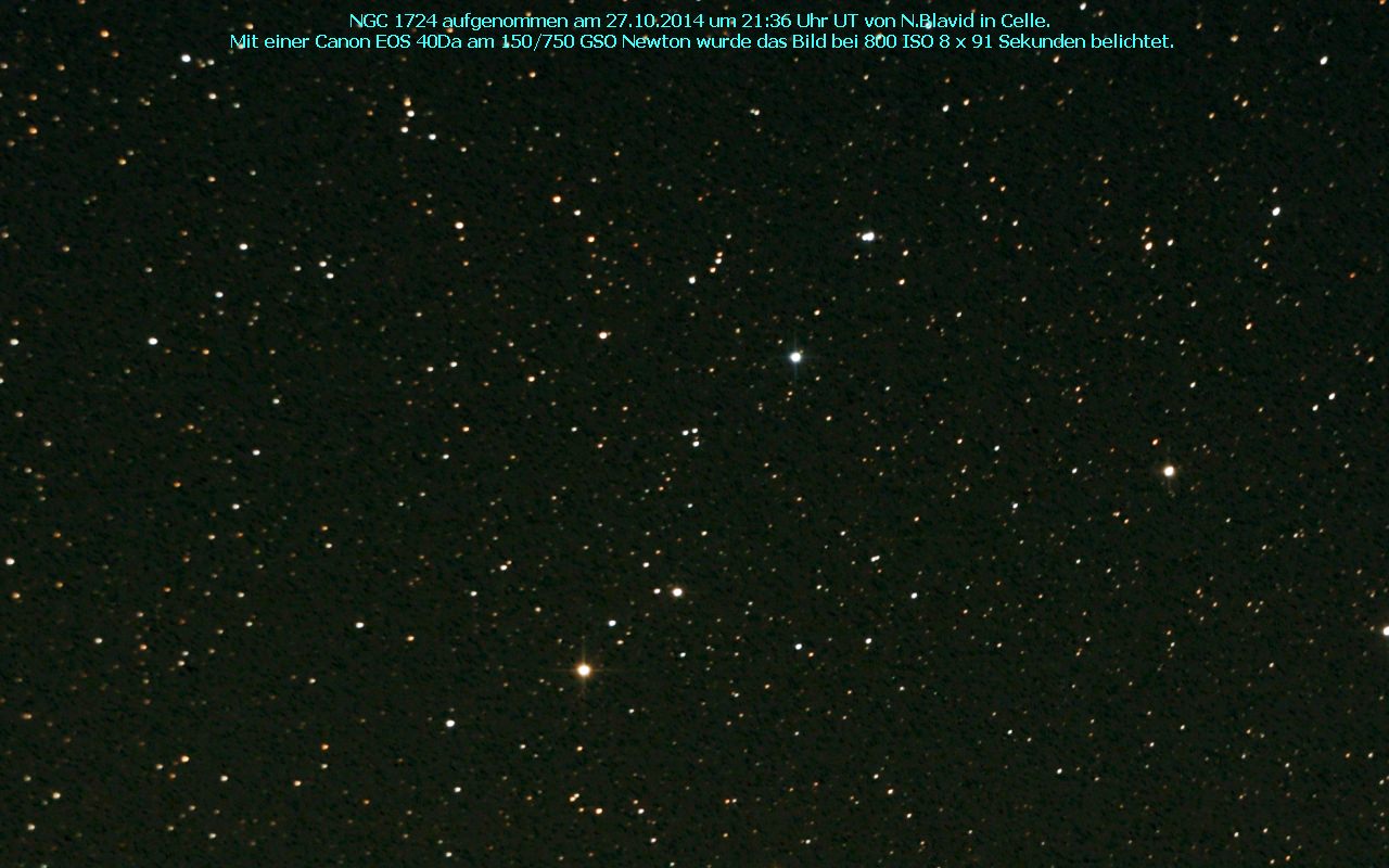 NGC 1724 ist ein offener Sternhaufen vom Typ ??. Er wurde am 4. April 1864 von Georg Friedrich Wilhelm Rümker entdeckt.