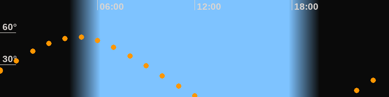 | Untergang | 12:12 Uhr im Nordwesten (αAz = 297,5°) |