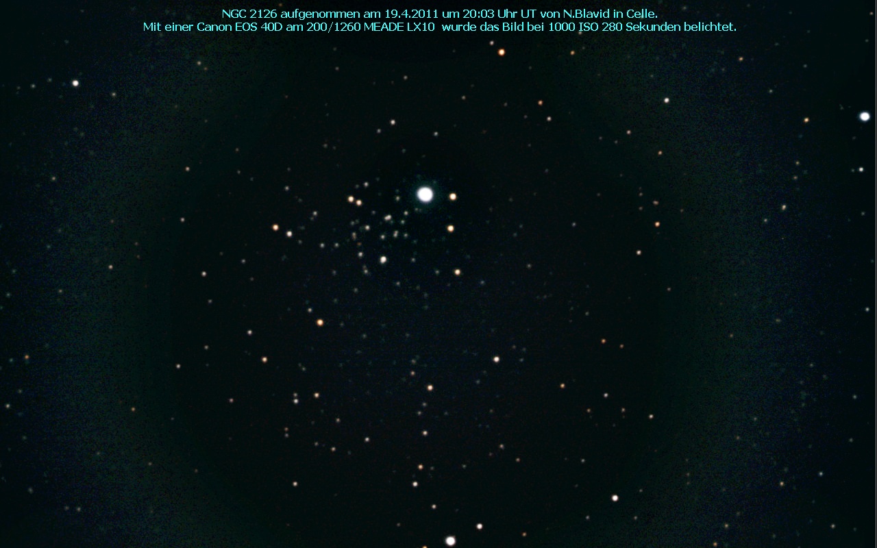 NGC 2126 ist ein offener Sternhaufen vom Typ III 2 m. Er wurde am 12. November 1787 von Friedrich Wilhelm Herschel entdeckt. Der Sternhaufen enthält rund 30 Sterne und ist ca. 400 Millionen Jahre alt.