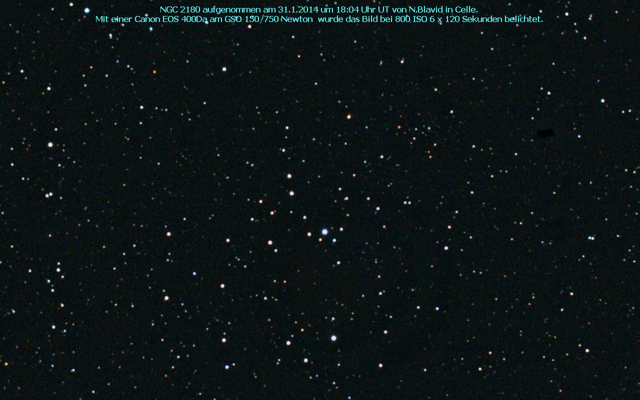 NGC 2180 ist ein offener Sternhaufen vom Typ OCL. Er wurde am 24. Januar 1784 von Friedrich Wilhelm Herschel entdeckt.