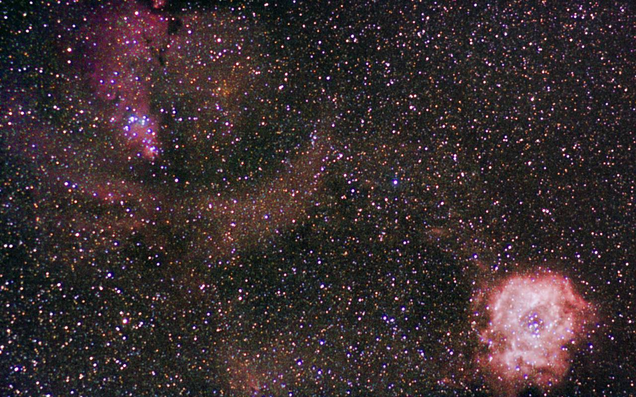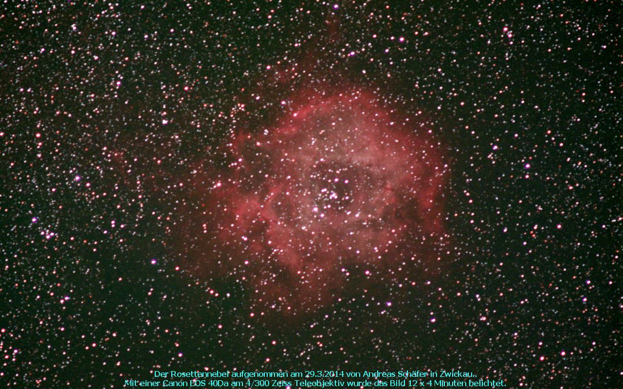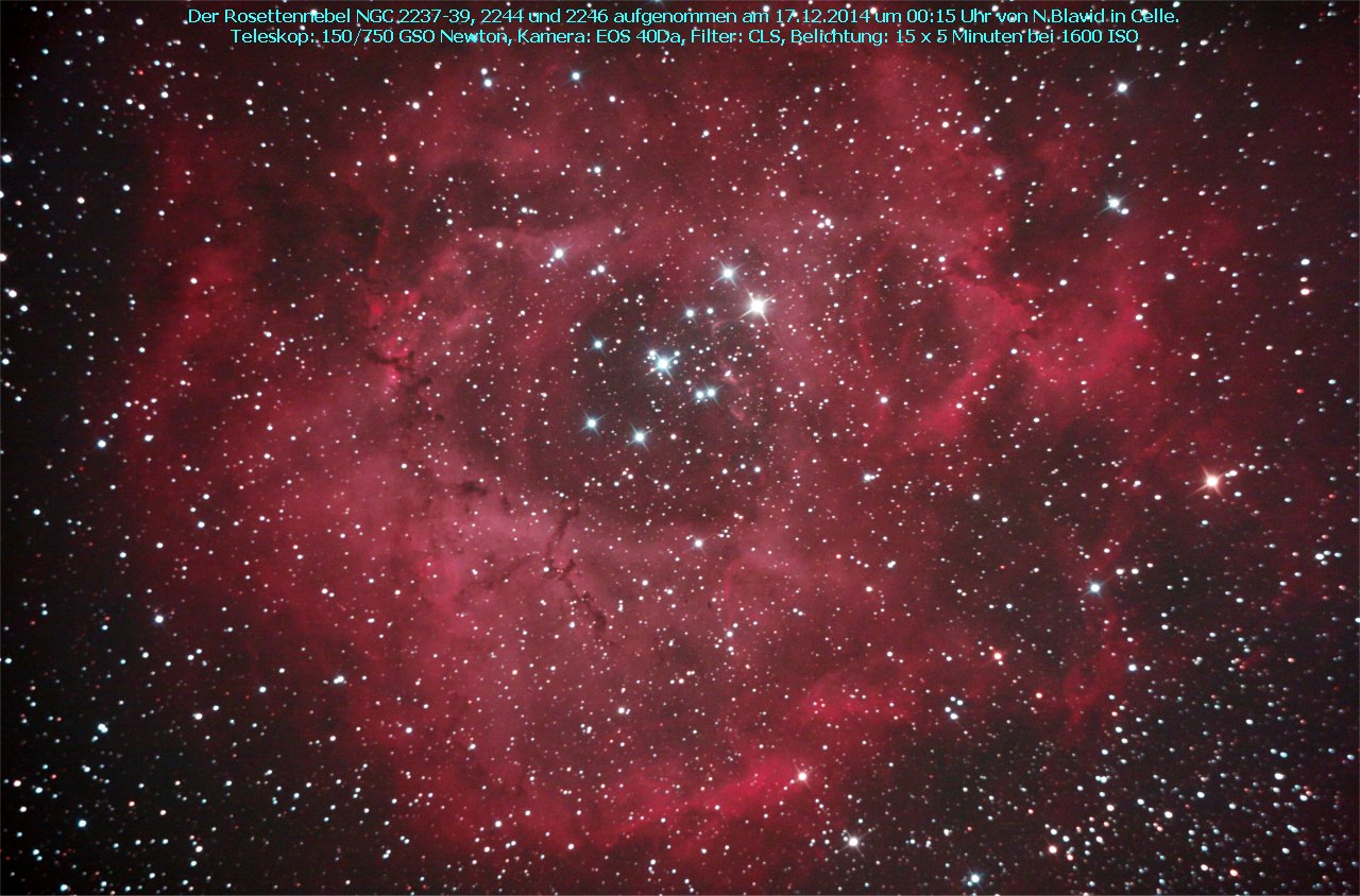 Der Rosettennebel ist ein großer Emissionsnebel, der durch die jungen hellen Sterne des Sternhaufens NGC 2244 innerhalb des Rosettennebels zum Leuchten angeregt wird. Der Nebel ist ein aktives Sternentstehungsgebiet. Entdeckt wurde das Objekt 1690 von John Flamsteed.