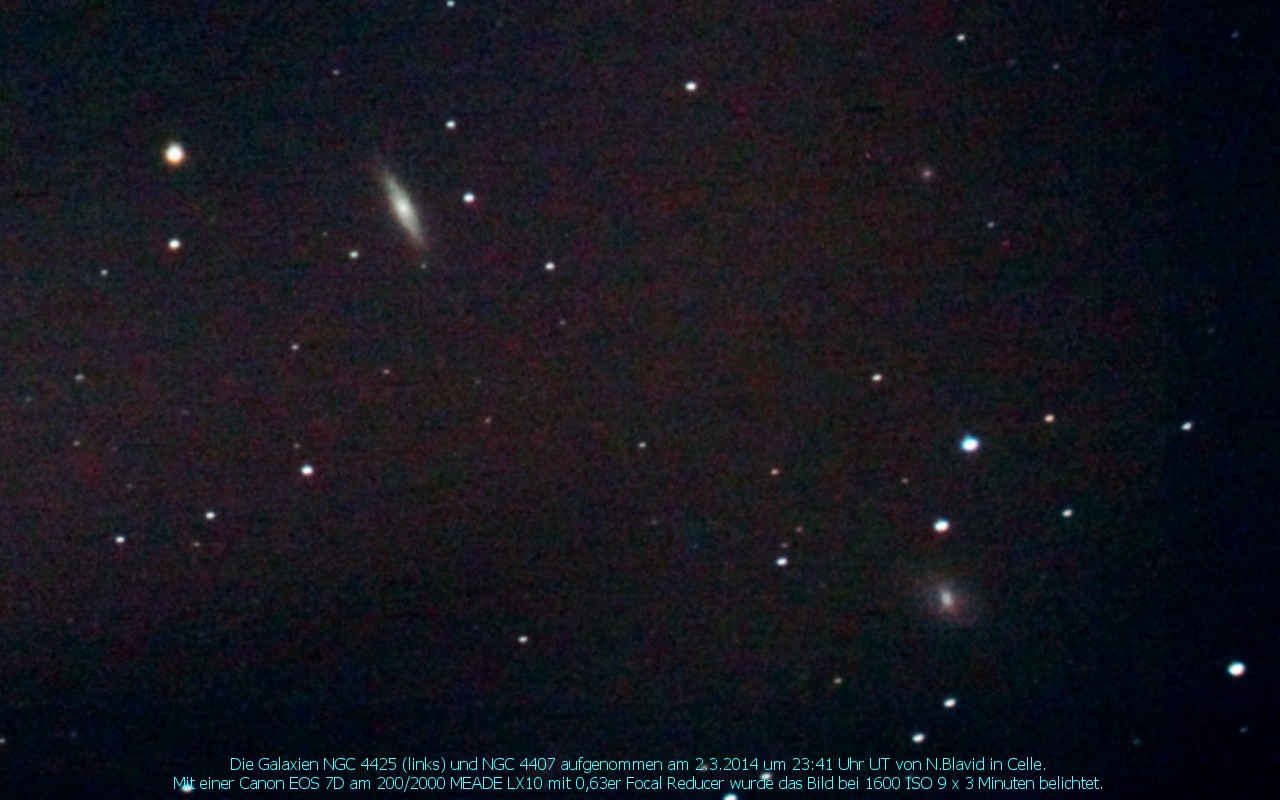Daten und Fakten: NGC4413 (NGC 4407, UGC 7538, PGC 40705) Rektaszension 12h 26m 32s Deklination 12° 36' 40'' Helligkeit 11,9 mag (13,0 mag/arcmin^2) Scheinbare Ausdehnung 2,3' x 1,4' Entfernung ca. 52 Mio ly Ausdehnung ca. 35000 ly Sichtbarkeit in Zwickau heute, 05.12.2025 Aufgang 00:29 Uhr im Osten (αAz = 69,1°) Höchster Stand (Kulmination) 07:39 Uhr (h = 51,9°) Untergang 14:45 Uhr im Westen (αAz = 290,9°) Standort: Zwickau, Algorithmen siehe Credits