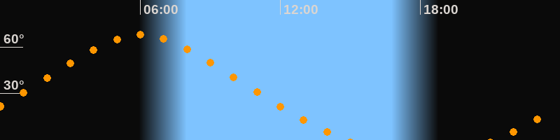 | Höchster Stand (Kulmination) | 06:00 Uhr (h = 67,8°) |