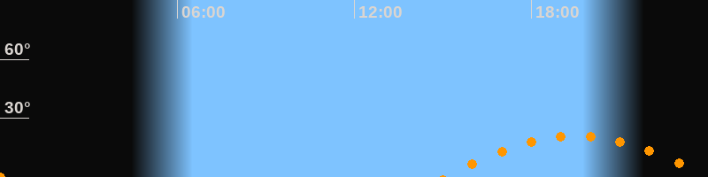 | Untergang | 23:59 Uhr im Südwesten (αAz = 240,9°) |