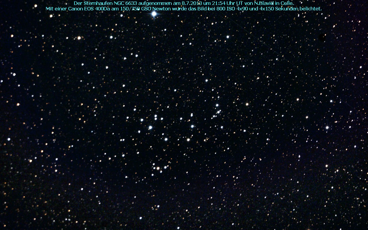 NGC 6633 ist ein ein offener Sternhaufen vom Typ III 2 m. Entdeckt wurde das Objekt 1745 von Phillipe Lois de Cheseaux.