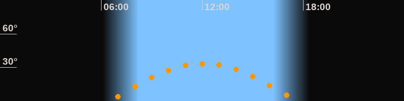 | Höchster Stand (Kulmination) | 12:03 Uhr (h = 33,5°) |