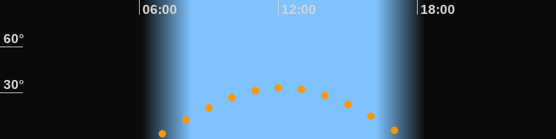 | Höchster Stand (Kulmination) | 12:08 Uhr (h = 33,5°) |