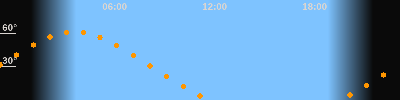 | Untergang | 12:30 Uhr im Nordwesten (αAz = 307,4°) |