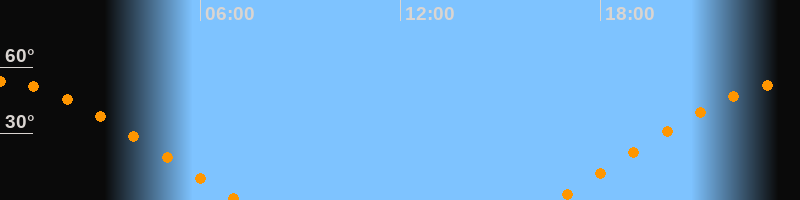 | Untergang | 07:09 Uhr im Nordwesten (αAz = 293,5°) |