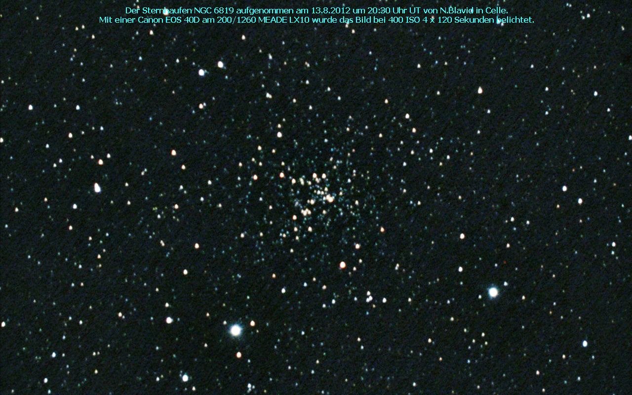 NGC 6819 ist ein ein offener Sternhaufen vom Typ I 1 r. Sein Alter beträgt ca. 2,5 Milliarden Jahre. Entdeckt wurde das Objekt am 12. Mai 1784 von Caroline Herschel.