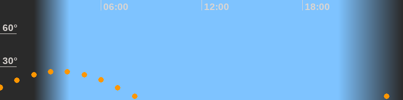 Daten und Fakten: NGC6822 (IC 4895, PGC 63616) Rektaszension 19h 44m 56s Deklination -14° 47' 21'' Helligkeit 8,7 mag (14,4 mag/arcmin^2) Scheinbare Ausdehnung 15,5' x 13,5' Entfernung ca. 1,6 Mio ly Ausdehnung 6000 ly Sichtbarkeit in Zwickau 28.05.2041 Aufgang 22:30 Uhr im Osten (αAz = 110,4°) Höchster Stand (Kulmination) 03:30 Uhr (h = 26,1°) Untergang 08:27 Uhr im Westen (αAz = 249,6°) Standort: Zwickau, Algorithmen siehe Credits