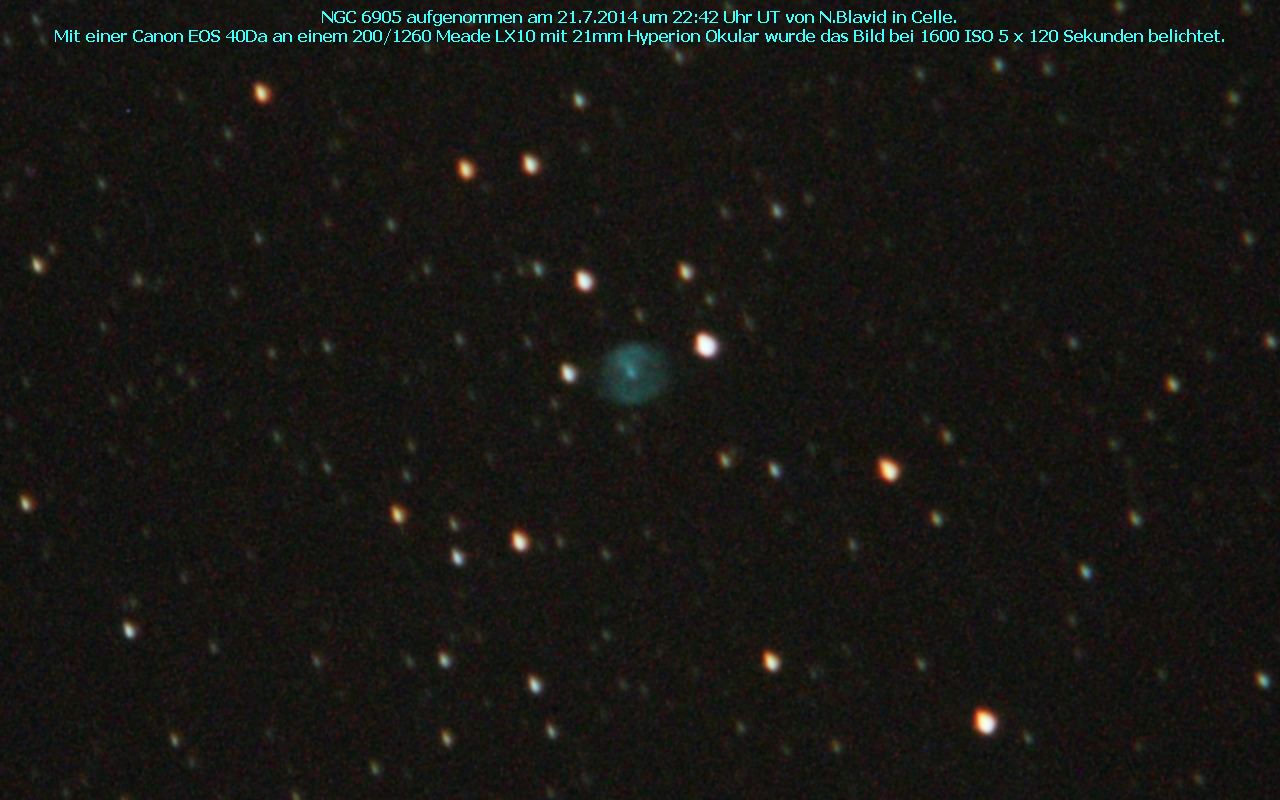 NGC 6905 ist ein planetarischer Nebel um den Zentralstern NT Del. Entdeckt wurde das Objekt am 16. September 1784 von Friedrich Wilhelm Herschel.