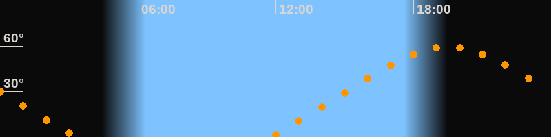 | Höchster Stand (Kulmination) | 19:30 Uhr (h = 59,4°) |