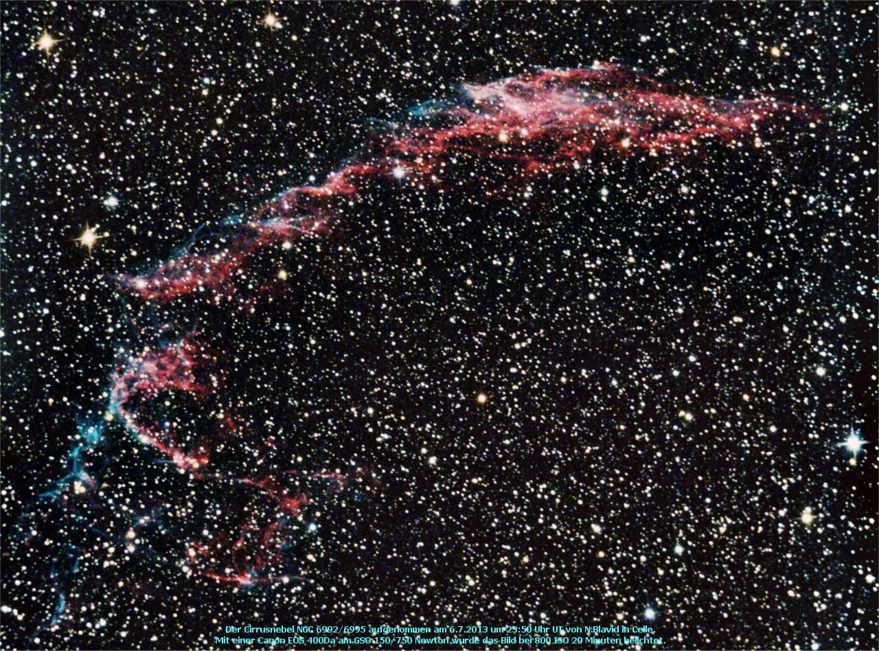 NGC 6992/95 ist der östliche Teil des Cirrusnebels. Der Cirrusnebel ist der Überrest einer Supernova, die vor ungefähr 8000-15000 Jahren explodierte. Dabei wurden durch die Schockwelle der Explosion die vorher ausgestossenen Gasschichten zum Leuchten angeregt. Diese dehnten sich seitem weiter aus und bilden heute den Cirrusnebel. Entdeckt wurde das Objekt am 5. September 1784 von Friedrich Wilhelm Herschel.