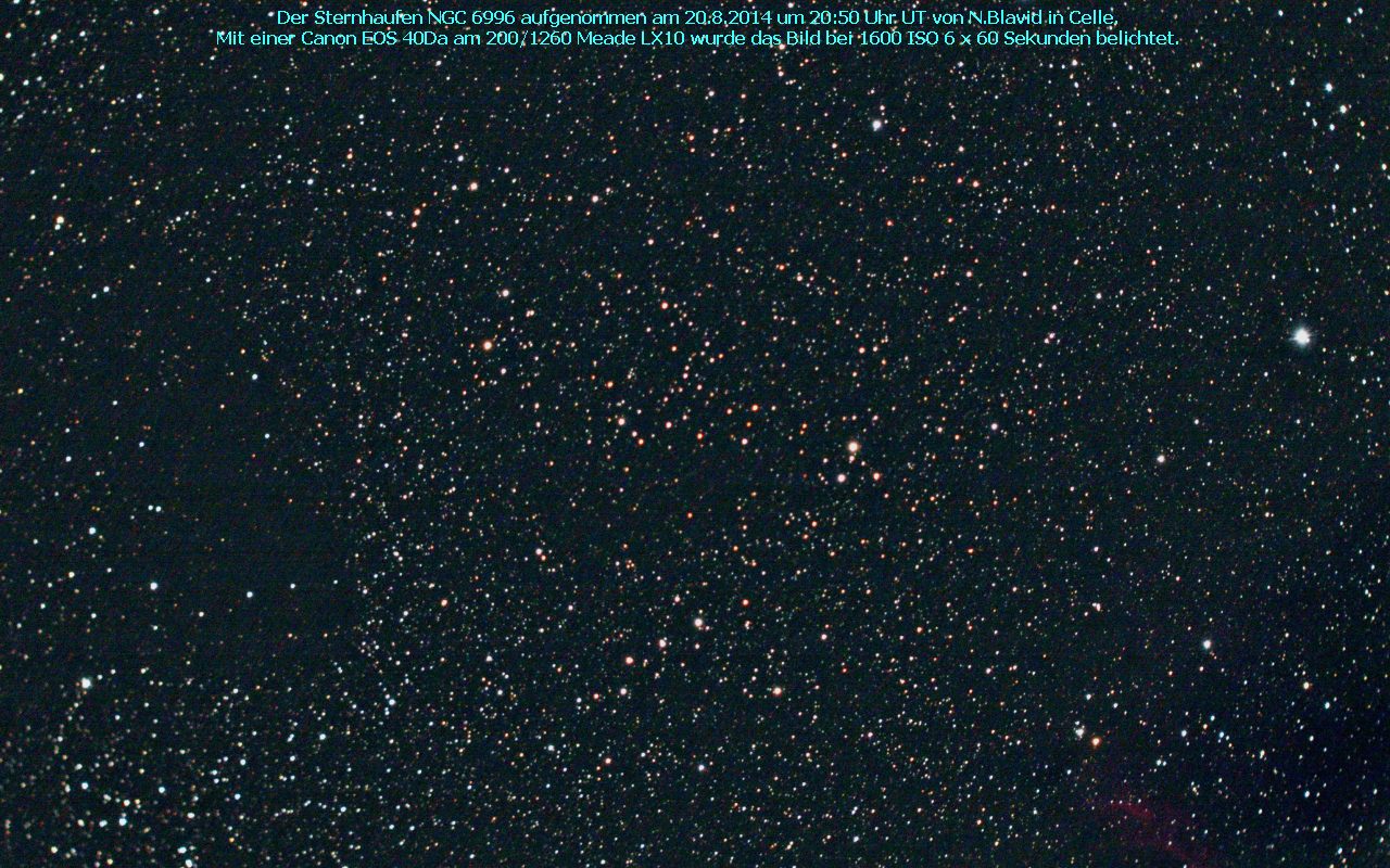 NGC 6996 ist ein ein offener Sternhaufen vom Typ III 2 p. Entdeckt wurde das Objekt am 28. Oktober 1828 von John Herschel.