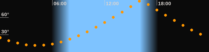 | Höchster Stand (Kulmination) | 16:11 Uhr (h = 89,9°) |