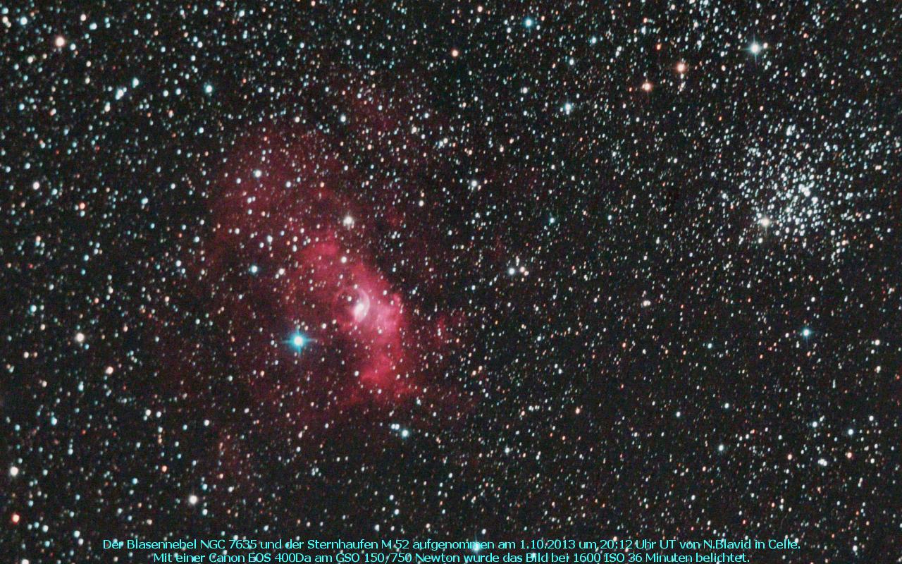 NGC 7635 ist ein Emissionsnebel, der durch den Wolf-Rayet-Stern SAO 20575 zum Leuchten angeregt wird. Dieser Stern ist auch für die markante Blase verantwortlich, die durch seinen Sternenwind entsteht. Entdeckt wurde das Objekt am 3. November 1787 von Friedrich Wilhelm Herschel.