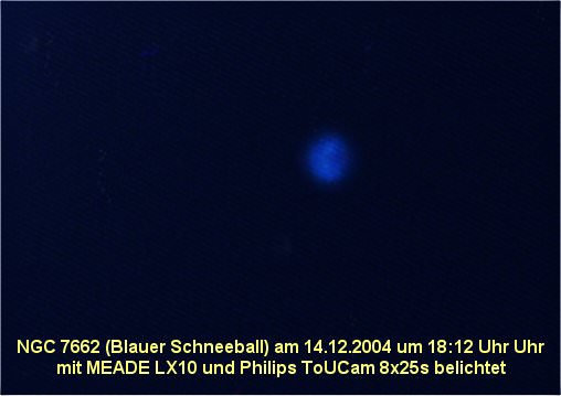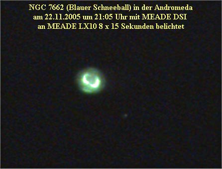 Der Blaue Schneeball NGC 7662 ist ein planetarischer Nebel um den Zentralstern HD 220733 (12-16mag). Entdeckt wurde das Objekt am 6. Oktober 1784 von Friedrich Wilhelm Herschel.