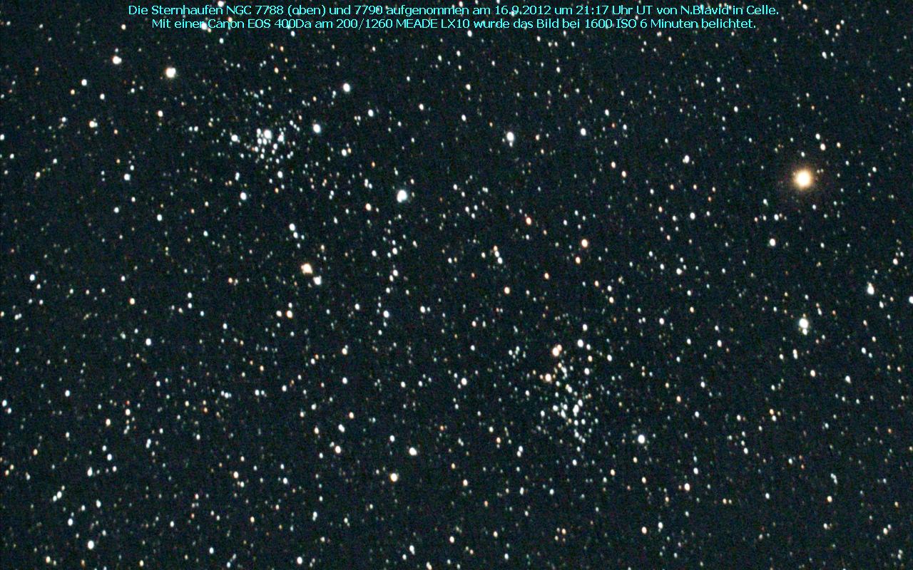 NGC 7790 ist ein ein offener Sternhaufen vom Typ II 2 m. Sein Alter beträgt rund 56 Millionen Jahre. Entdeckt wurde das Objekt am 16.Dezember 1788 von Friedrich Wilhelm Herschel.
