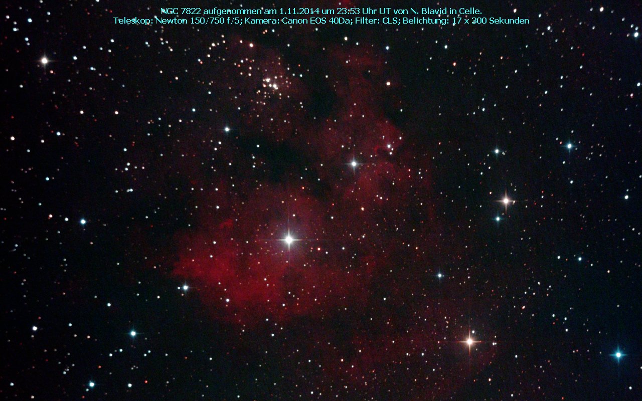 NGC 7822 ist ein Emissionsnebel, der durch den Sternhaufen Berkley 59 zum Leuchten angeregt wird. Entdeckt wurde das Objekt am 16. November 1829 von John Herschel. Der Sternhaufen ist 5-6 Millionen Jahre alt.