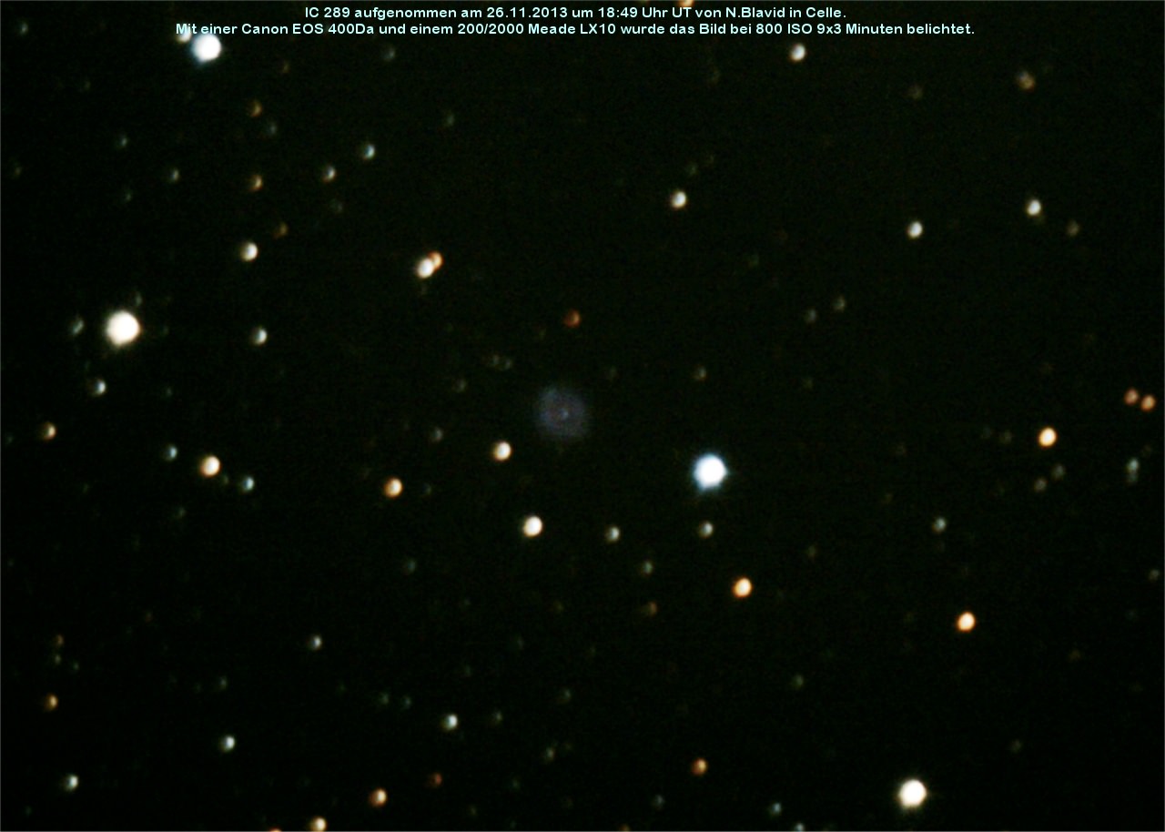 IC 289 ist ein planetarischer Nebel um einen 16,3 mag hellen Zentralstern. Entdeckt wurde das Objekt 1888 von Lewis Swift.