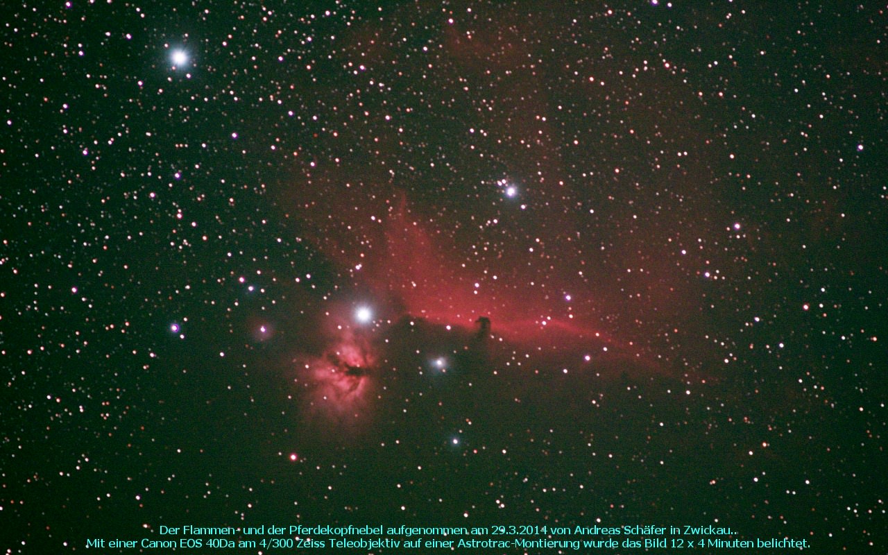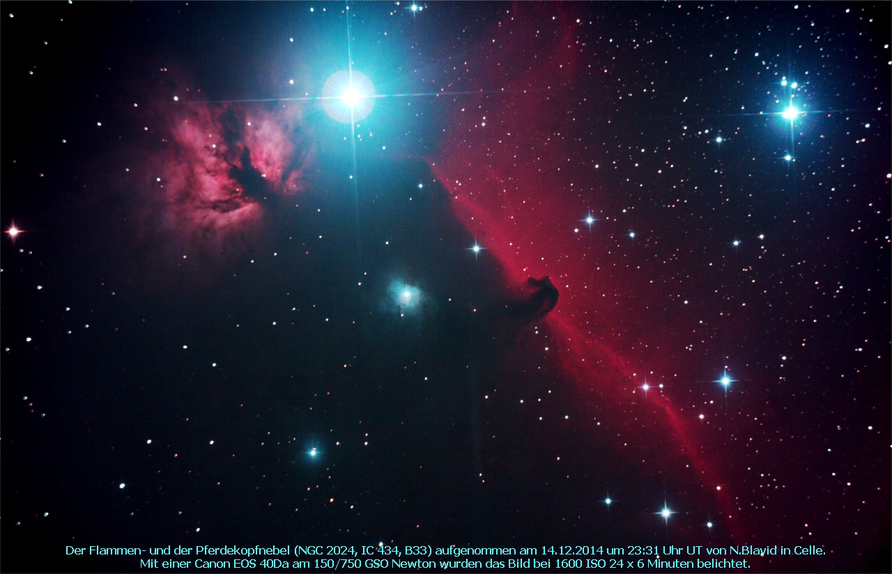 Der Pferdekopfnebel - ein Dunkelnebel (B33) vor einem Emissionsnebel (IC 434) und der Flammennebel (NGC 2024) im Orion
