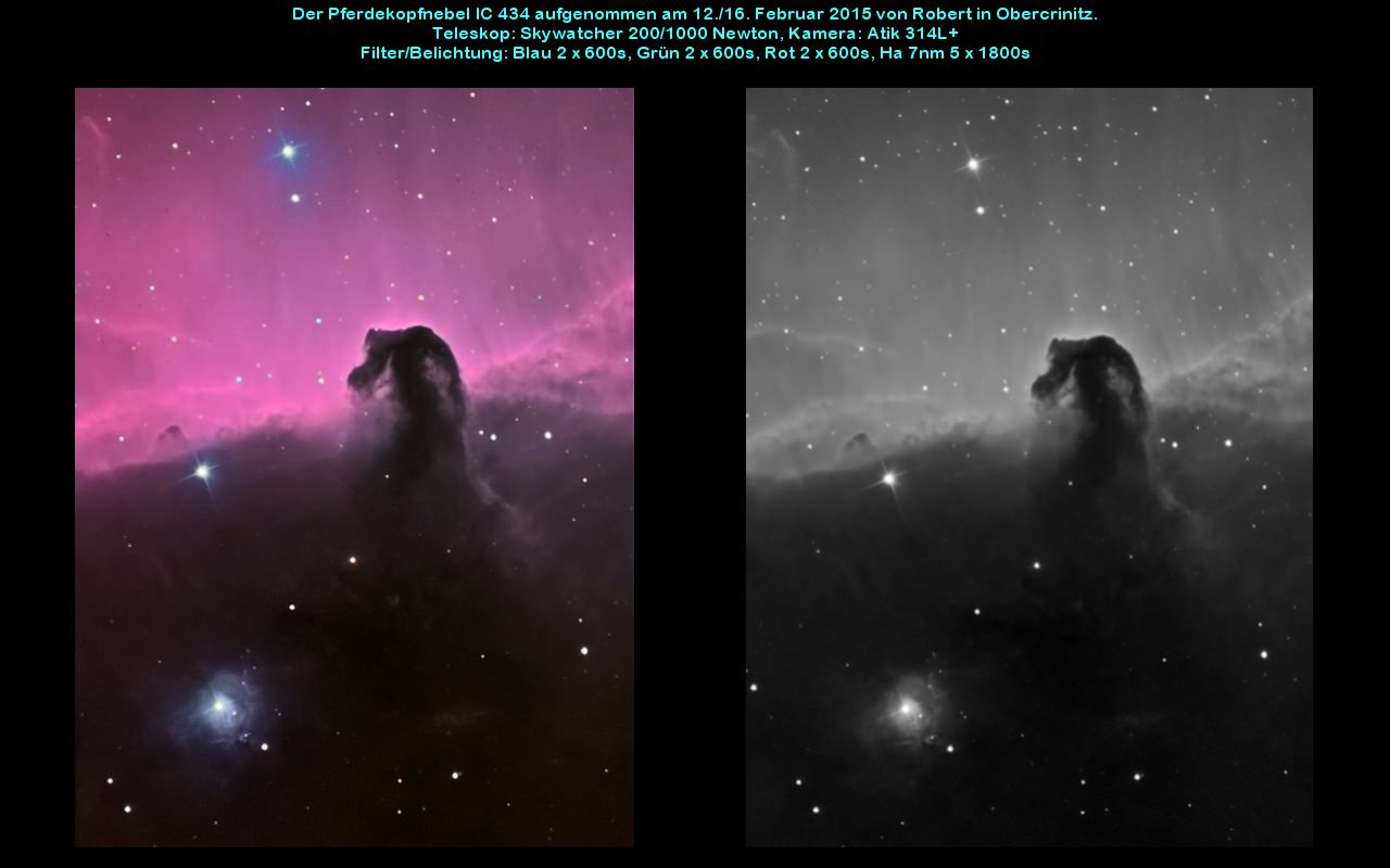Der Pferdekopfnebel ist ein Dunkelnebel, der sich vorm Hintergrund des Emissionsnebels IC 434 als dunkler Schatten abhebt. IC 434 wird vom Stern Sigma Orionis zum Leuchten angeregt. Entdeckt wurde der Nebelkomplex 1888-1890 von Williamina Fleming.