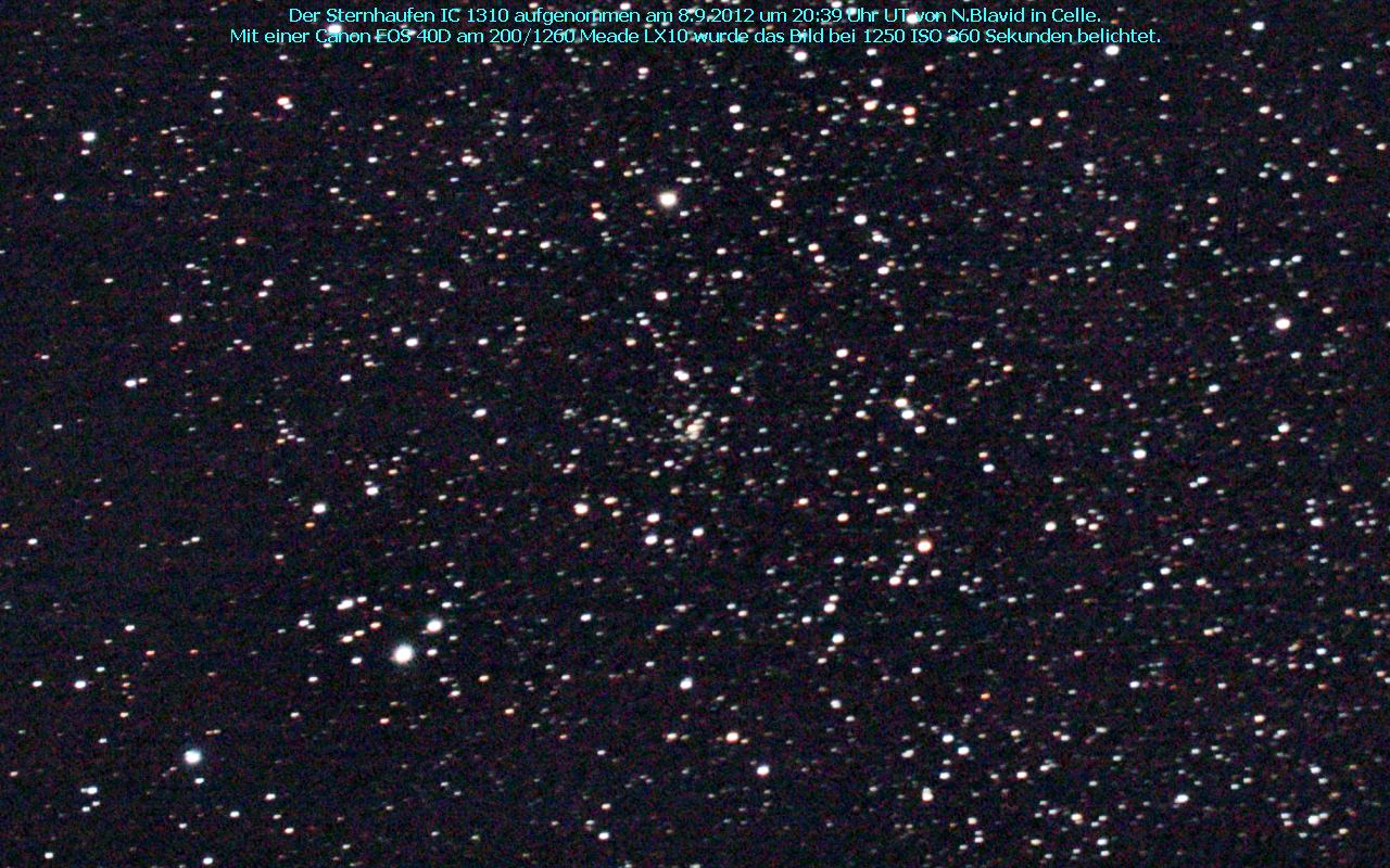 IC 1310 ist ein ein offener Sternhaufen vom Typ II 1 p. Entdeckt wurde das Objekt am 19. September 1893 von Thomas Espin.