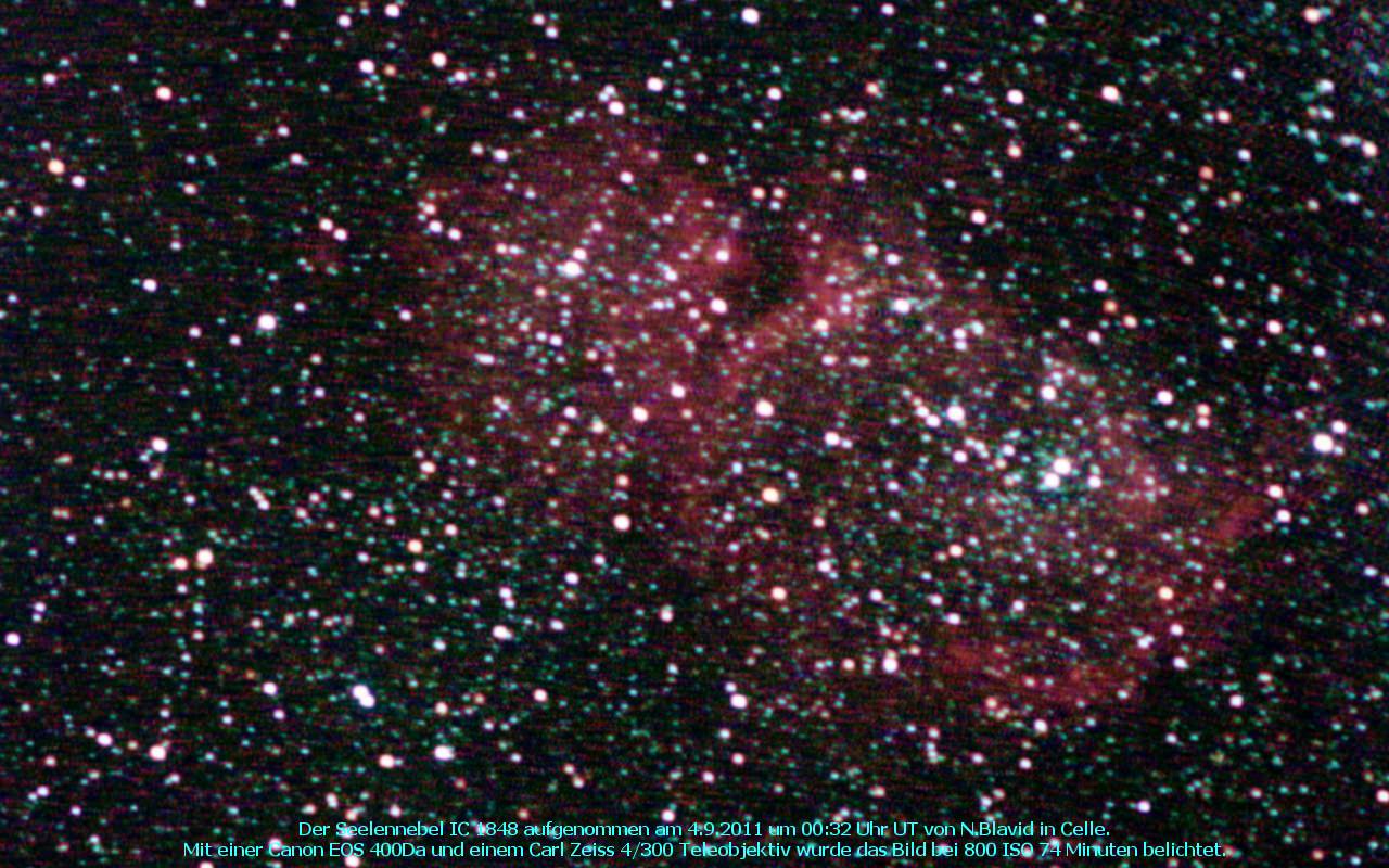 Der Seelennebel IC 1848 ist ein Emissionsnebel mit mehreren offenen Sternhaufen (cr34, cr632, cr634). Der Herznebel wurde in 1890ern von Edward Emerson Barnard entdeckt.