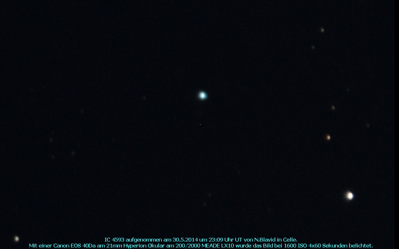 IC 4593 ist ein planetarischer Nebel um einen 11 mag hellen Zentralstern. Entdeckt wurde das Objekt 1907 von Williamina Fleming.