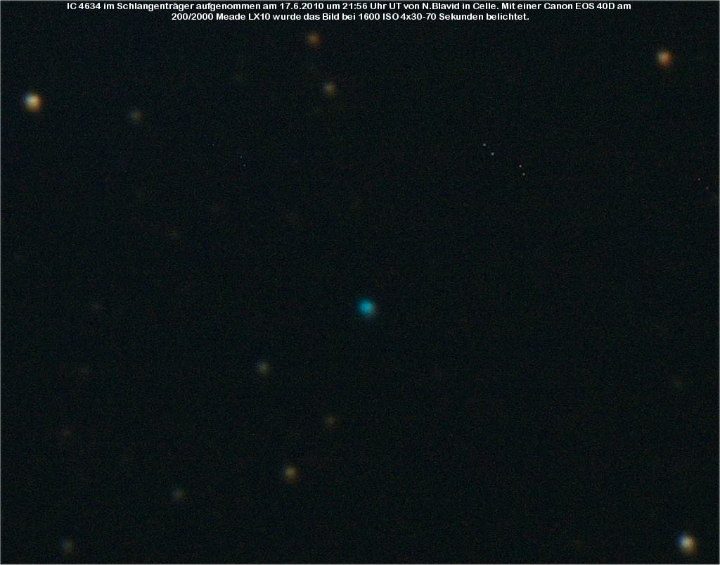 IC 4634 ist ein planetarischer Nebel um den Zentralstern HD 153655 (13,8 mag). Entdeckt wurde das Objekt 1893 von Williamina Fleming.