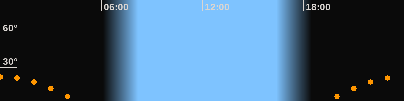 | Untergang | 04:34 Uhr im Südwesten (αAz = 242,4°) |