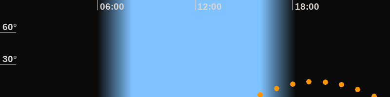| Untergang | 23:11 Uhr im Südwesten (αAz = 229,6°) |