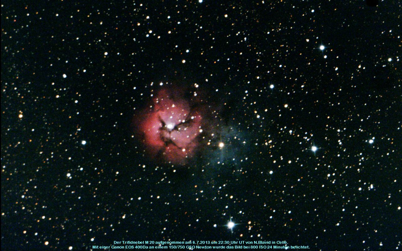 Der Trifidnebel ist ein Emissions- und Reflexionsnebel. Die den Nebel teilende Staubwolke heißt Barnard 85. Entdeckt wurde er am 5. Juni 1764 von Messier.