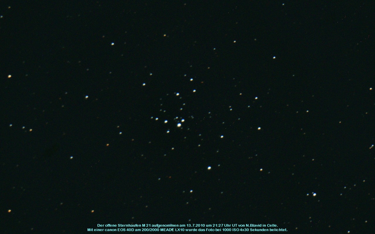 M 21 ist ein offener Sternhaufen mit 57 Sternen. Er ist vom Typ I 3 m, sein Alter wird auf 4,6 Millionen Jahre geschätzt. Entdeckt wurde er 1764 von Messier.