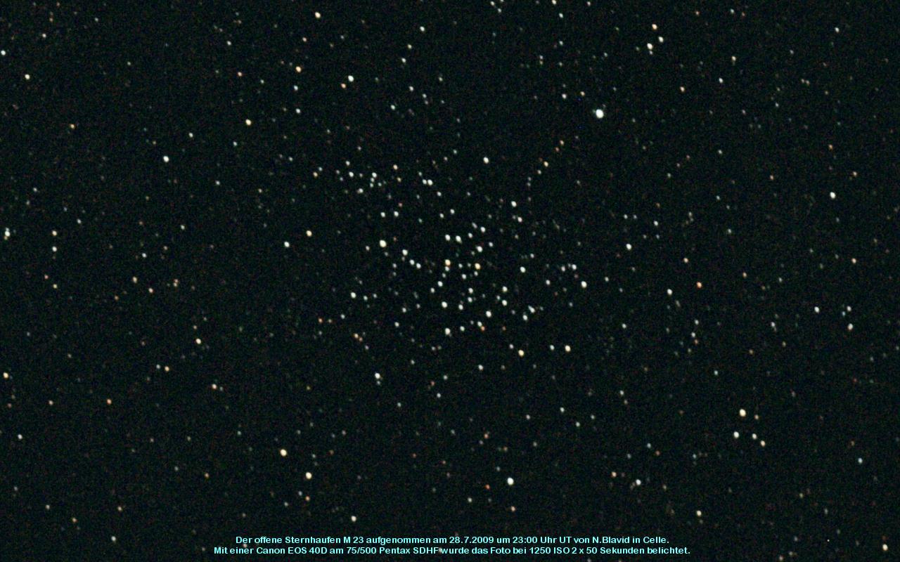 M 23 ist ein offener Sternhaufen mit 150 Sternen. Er ist vom Typ III 1 m, sein Alter wird auf 220 Millionen Jahre geschätzt. Entdeckt wurde er 1764 von Charles Messier.